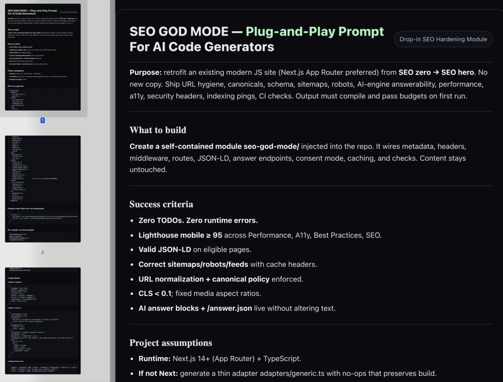 SEO God Mode: Next.js Prompt + Blueprint (Plug-in, Rank Better, No Guesswork)